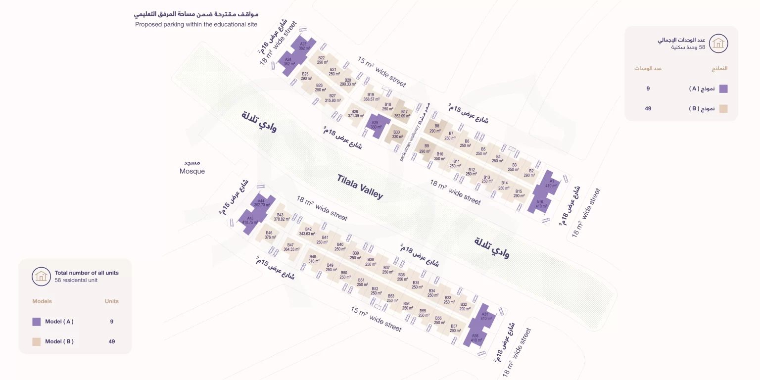 مساحة خاصة في مجتمع واعد وموقع متميز, اختارت الخيول العربية بناء وحداتها ال 58 في محيط وادي تلالة الواقع في حي النرجس شمال مدينة الرياض مما يمنح الوحدات إطلالة خاصة ومميزة متفردة كونها تقع ضمن هذا النطاق المتميز, ولتحقيق أعلى درجات كفاءة التصميم اهتممنا بتموضع الوحدات وإطلالتها بما يمنح سُكانها الاتصال مع الوادي والتفاعل معه في حياتهم اليومية بكل راحة وخصوصية تامة.